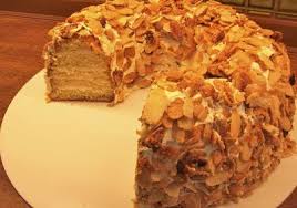 — Le gâteau sorti du four étant refroidi, le couper en 3 tranches dans l’épaisseur ………… Tartiner chaque tranche + le dessus de la couronne avec la crème au beurre. ……………. puis reconstituer la couronne……………. Parsemer d’amandes effilées torréfiées.