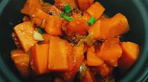 —Dans une grande poêle, sur feu moyen, chauffer l’huile. Y faire suer 3 mn ail + gingembre + échalotes sans cesser de remuer …………………. Ajouter cubes de potiron + sucre brun. Mélanger toujours 7 à 8 mn …………… Arroser de bouillon + sauce de poisson. Mélanger sur feu doux jusqu’à évaporation complète du liquide ( 5 à 7 mn) ……………………… Saler, poivrer. Arroser de jus de citron vert et mélanger une dernière fois avant de servir.