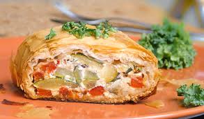 Etaler la farce à 2 cm d’un des bords de feuille ( s) et rouler un peu serré (en rabattant les bords extérieurs vers l’intérieur dès le 1er tour complet autour des légumes) et ce jusqu’au bout des ( ou de la) feuille(s) de pâte.
