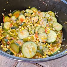 —Dans une cocotte, chauffer l’huile …… Y faire doucement suer 5 mn oignons + ail en touillant régulièrement sans les laisser dorer ……………… Ajouter courgettes + haricots verts + piments et mélanger 3 mn …………………………………………………. Ajouter tomates concassées + sel + poivre. Couvrir et laisser doucement mijoter 15 mn …..……… Incorporer les grains de maïs. Mélanger. Couvrir à nouveau et poursuivre la cuisson 10 mn: les légumes doivent rester un peu croquants !.