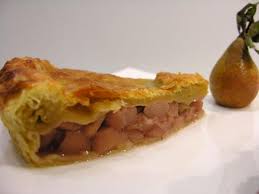Pendant ce temps, beurrer et fariner une tourtière ( genre moule à tarte avec les bords un peu plus hauts). Etaler un des rouleaux de pâte et garnir le moule. Piquer légèrement le fond et disposer les lamelles de poires dessus. Saupoudrer de sucre et poivrer légèrement.
