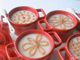 Décorer le dessus des crèmes avec des dessins en poudre de cannelle. Intercaler dessus qq quartiers d’oranges et des feuilles de menthe.