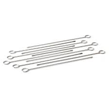 Façonner 8 brochettes en intercalant viande + fromage + mortadelle + pain et recommencer jusqu’à épuisement des ingrédients.