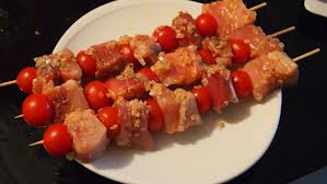 Enfiler les brochettes en alternant porc + lard + oignon + tomate et recommencer jusqu’à épuisement des ingrédients en ayant formé 4 ou 8 brochettes.