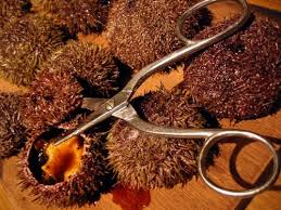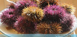 Avec une cuillère à café, de préférence à dents ( = cuillère à pamplemousse ou avocat), gratter l’intérieur de l’oursin pour recueillir les langues ( au nombre de 5 en général) et le jus que vous mettez dans un bol.