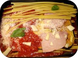 Etaler 2 couches de macaronis dans le fond de terrine. Puis du jambon. Puis une couche de tomates au basilic …. et ainsi de suite en terminant par des macaronis.