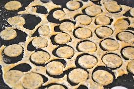 Découper des ronds d’environ 4 cm ( à l’aide du bord d’un verre à liqueur). Déposer les ronds de pâte au fur et à mesure sur la plaque du four.