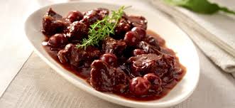 Servir la viande nappée de sa sauce, entourée de cerises et de croûtons frits et parsemée de persil.