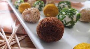 Pour envelopper les boulettes de fromage: 125 g de noisettes pilées ou amandes ou noix pilées – 1 bouquet de ciboulette ciselée – 125 g de noix de coco râpée – 2 cuillères à soupe de curcuma – 125 g de graines de pavot, de sésame, de lin, de fenouil … – du jambon fumé grillé à sec dans une poêle, refroidi et pilé – des piments secs en filaments – du cumin en poudre ou en grains – du Parmesan …………… faites travailler votre imagination car toutes sortes de combinaisons sont possibles.