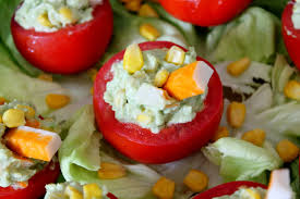 Dans un saladier, bien mélanger crème fraîche + jambon + maïs + sel + poivre. En farcir les tomates.
