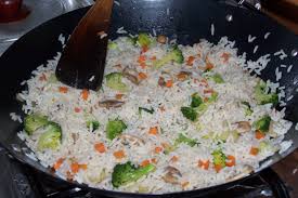 Incorporer riz + huile de sésame. Sans cesser de remuer, laisser frire le riz 5 mn environ.