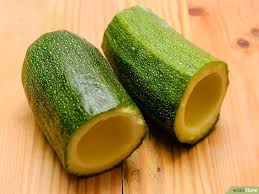 Couper le pédoncule (trognon) des courgettes. Creuser et vider le centre des courgettes avec un vide-pomme ou avec une petite cuillère à dents, sans entamer la peau.