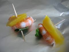 Servir à l’apéritif, frais mais pas froid, avec des pics (éventuellement mélanger avec des gambas décortiquées).
