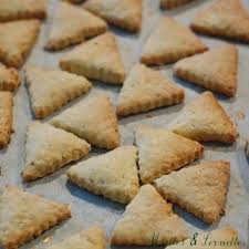 Découper des triangles de 5 à 6 cm de côté. Les décoller avec précaution de la plaque pour les disposer sur une grille ou un plat. Laisser refroidir complètement avant de déguster.