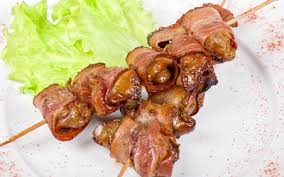 Façonner les 4 brochettes en alternant 1 foie de volaille enroulé de lard + 1/3 de feuille de sauge + 1/3 de foie de volaille …. jusqu’à épuisement des ingrédients.