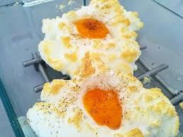 Avec le dos d’une cuillère à soupe, écraser un peu le centre de chaque blanc battu pour y laisser un creux. Dans chacun, déposer 1 jaune d’oeuf. Saler, poivrer.