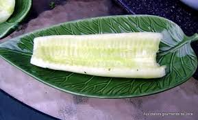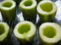 Peler les concombres. Les couper en 2 puis transversalement dans la longueur ( vous devez obtenir 8 tronçons). Retirer les graines en creusant un peu. ( ou bien découper des tronçons que vous creusez comme sur la photo ci-dessus).