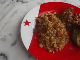 Pendant ce temps, dans une poêle, chauffer le reste d’huile. Y jeter le riz et remuer jusqu’à ce que le riz devienne transparent. Saler, poivrer. A 1 h de cuisson de la viande, rajouter le riz. Couvrir. Poursuivre la cuisson 20 à 25 mn.