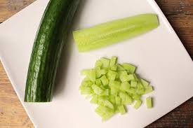 Pendant ce temps: – Peler les concombres. Les couper en 2 dans la longueur. Retirer les pépins. Découper la chair en dés.
