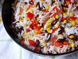 Dans un saladier, mélanger riz + oignon + poivron + haricots rouges + maïs + jambon + les lardons et leur sauce.