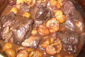 Saler, poivrer éventuellement après avoir goûté la sauce. Sortir la viande et les marrons à l’écumoire pour le plat de service.