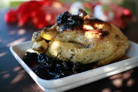 Servir la dinde découpée accompagnée de sa farce et sa compotée de pruneaux + les pruneaux en brochette dont chacun se servira.