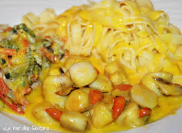 Détailler les coquilles st Jacques en 2 ou 3 lamelles. Les ajouter dans la sauce + les champignons. Napper les nouilles de cette sauce. Mélanger et servir chaud.