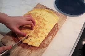 La faire glisser sur une assiette. Poser une autre assiette par-dessus et retourner le tout. Glisser à nouveau l’omelette dans la poêle et la faire dorer 3 à 4 mn. Oter du feu.