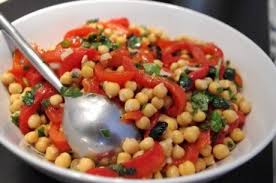 Dans un saladier, mélanger pois chiches + lanières de poivrons + oignon + dés d’orange + vinaigre + huile + sel + poivre.