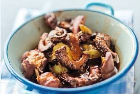 Ajouter la marinade + ail + bouquet garni + concentré e tomate + vin blanc + 1/2 verre (10 cl) d’eau chaude. Bien mélanger. Couvrir. Laisser doucement mijoter 1 h 30.