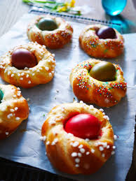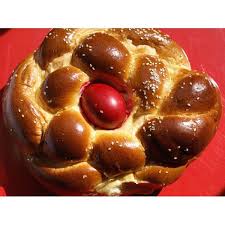 ( la tradition en Grèce veut de placer au centre de la brioche des oeufs, frais vidés ou cuits durs, peints en rouge. Vous pouvez aussi en peindre de différentes couleurs)