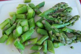 Peler les asperges ( sauf les vertes). Couper les pointes et jusqu’à la moitié de la queue en petits tronçons. Rincer et sécher.