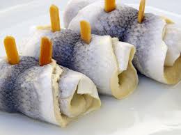Etaler devant vous les 4 filets de harengs restants. Déposer sur chacun de la pâte et les rouler en roll mops. Les maintenir roulés par 1 ou 2 pics en bois.