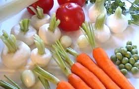 Porter à ébullition une grande quantité d’eau salée. Y jeter haricots verts + carottes + navets + petits pois pour 10 mn. Les égoutter.