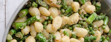 Dans la même poêle, chauffer de l’huile d’olive. Y faire dorer les gnocchis 3 à 4 mn. ( pour des gnocchis frais, les plonger 3 à 4 mn dans de l’eau frémissante, ils sont cuits lorsqu’ils remontent à la surface). Oter du feu.