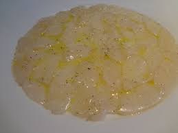 Le poisson doit être très frais: – Découper les filets de daurade en tranches extra-fines. Les disposer au fur et à mesure sur 4 assiettes de service en les faisant se chevaucher légèrement. Placer les assiettes au frigo jusq’au moment de les servir.