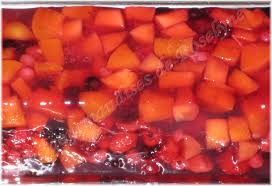Remettre 1 couche de pêches, recouvrir de gelée. Remettre au frigo 15 mn et continuer cette même opération jusqu’à épuisement des pêches et de la gelée, en plaçant le moule à chaque couche 15 mn au frigo.