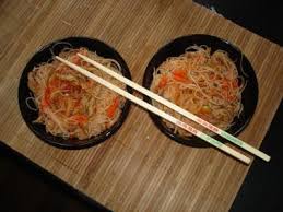 Porter de l’eau bouillante salée à ébullition. Y plonger 5 mn le vermicelle de riz non coupé. Egoutter.