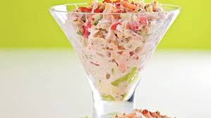 Dans un saladier, mettre concombre + crabe + céleri + ananas + Cognac + la sauce bien fouettée dans le bol. Bien mélanger. Répartir cette salade dans les coupes, sur les feuilles de laitue.