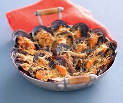 Retirer 1 des 2 coquilles de chaque moule. Disposer au fur et à mesure les moules en coquille, bien à plat, dans un plat creux ou plusieurs plats individuels pour le four.