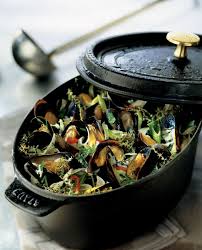 Mettre les moules ( avec ou sans coquilles) dans la cocotte et bien remuer le tout 3 mn pour réchauffer.