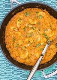 Le poulet ayant cuit 1 heure, y mettre les crevettes fraîches et leur marinade. Touiller et poursuivre la cuisson douce 10 mn à couvert.