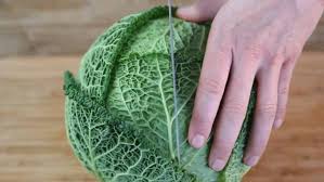 Retirer le trognon du chou + les grosses feuilles du pourtour. Couper le chou en 2 puis émincer en lanières fines chaque moitié du chou.