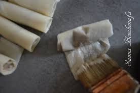 Prendre 1 feuille de brick. Déposer au milieu 1 cuillère à café de farce. Rouler la feuille en cigare en rentrant les extrémités vers le centre après le 1er tour d’entourage de la farce.