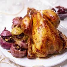 Servir le poulet découpé accompagné de sa farce et de son jus de cuisson.
