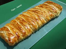Prendre le 2ème rouleau de pâte feuilleté. Le couper en rectangle de la même taille que le 1er. Plier la pâte en 2 sur sa longueur. Y faire des entailles au couteau en laissant intact 2 cm tout le tour. Déplier la pâte à plat. Déposer ce rectangle entaillé pour couvrir la farce. Bien appuyer tout autour pour souder les 2 abaisses de pâte. Chiqueter la pâte tout autour de la tourte ( = pratiquer de petites entailles au couteau sur l’ourlet qui soude les 2 pâtes, tout autour).