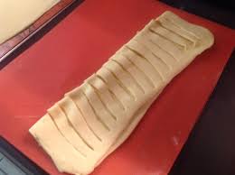 Beurrer et fariner une plaque pour le four. Y déposer 1 rouleau de pâte feuilletée. La retailler en une bande rectangulaire.