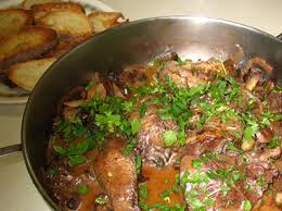Mettre les morceaux de poulet + la moitié des tiges de persil + thym + champignons + ail . Faire sauter le tout 5 mn.
