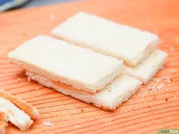 Beurrer les tranches de pain de mie des 2 côtés. Les faire griller ( au four ou à la poêle ). Les couper en 2.