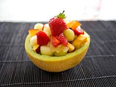 Marinade: – Couper le melon en 2. Retirer les pépins. A l’aide d’une cuillère parisienne, prélever un maximum de boulettes de melon que vous mettez dans un saladier ( ou bien retirer la chair au couteau ou avec une cuillère à soupe et la couper en dés). Presser un peu, sans les abîmer car elles serviront de présentoirs, les écorces des demi-melon pour extraire du jus dont vous arrosez le melon.